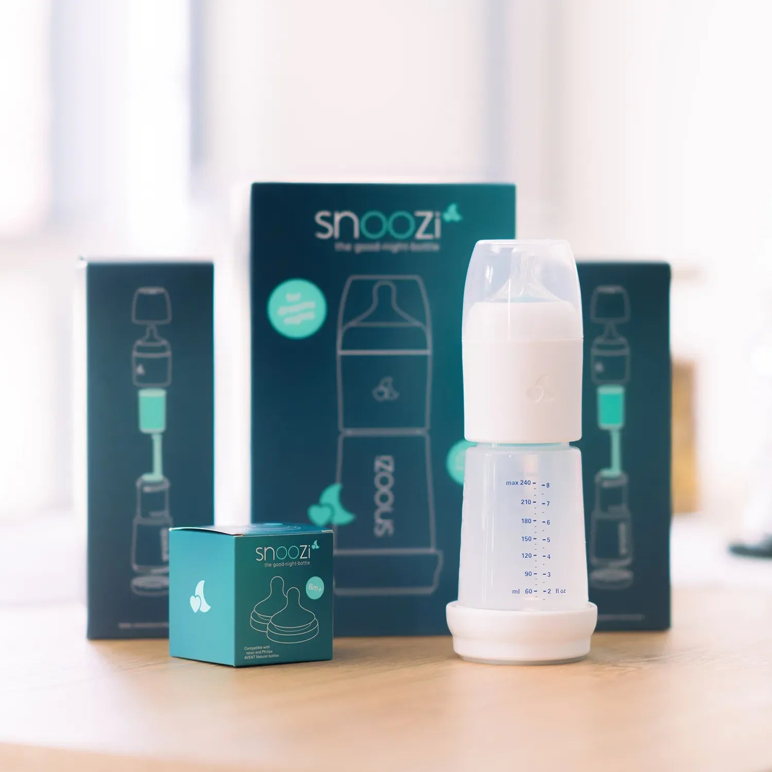 S inovativnim Snoozi setom koji se sastoji od noćne bočice i grijača, pripremaš savršeno temperiranu bočicu u sekundi – svježu, higijensku i bez stresa.